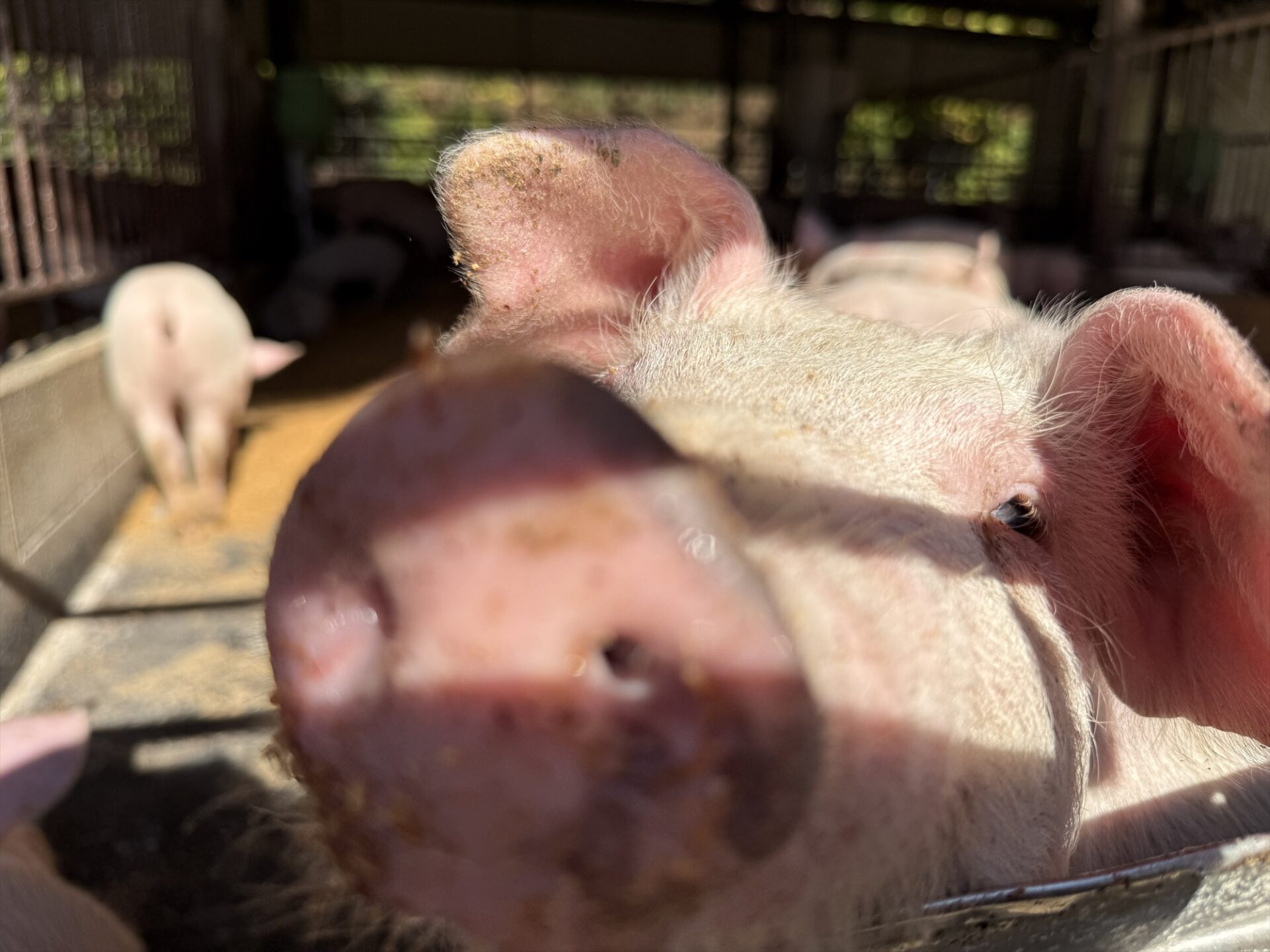 母豚と子豚が離れる時期です(離乳)。少しずつ餌にも慣れながら新生活のスタートです。